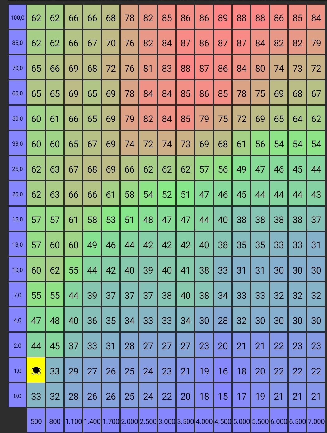 Das Kennfeld ist ein Schnellschuss. MAP ist schon be relativ leichter Last bei 90%. D.h. eine Vorzündung bei Teillast klebt dann weit oben.