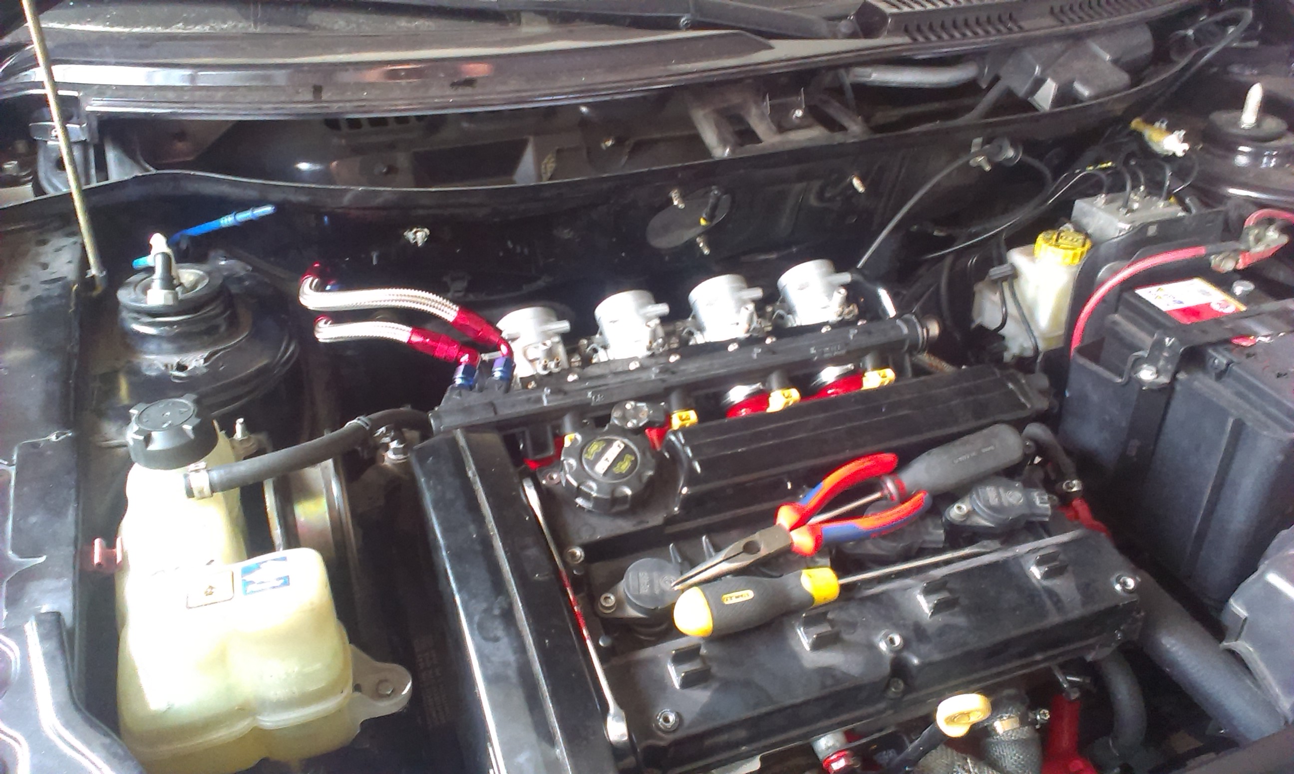 Zu meinem System es handelt sich um einen Punto 1.8l 16v Motor wie er auch in der Barchetta oder im Coupe zum Einsatz kam, allerdings hab ich eine Einzeldrosselklappenanlage von der GSXR drauf gebaut, Einspritzanlage (Kraftstoffpumpe, Einspritzdüsen, Benzindruckregler) sind vom Alfa Romeo 2.0l 16v TS.
