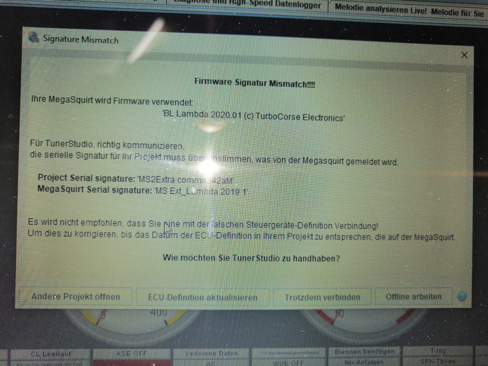 Beim verbinden mit dem Tunerstudio kommen aber allerhand Probleme, zuletzt ist jetzt garkeine Verbindung mehr möglich.