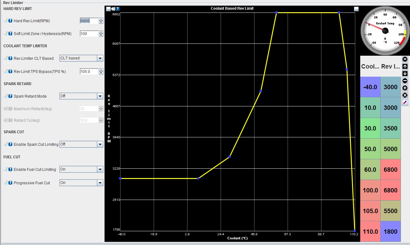 Hard Rev Limit (RPM) - This is the point at which a fuel cut or complete spark cut is applied. The coolanttemp limiter, if used, will override this setting.