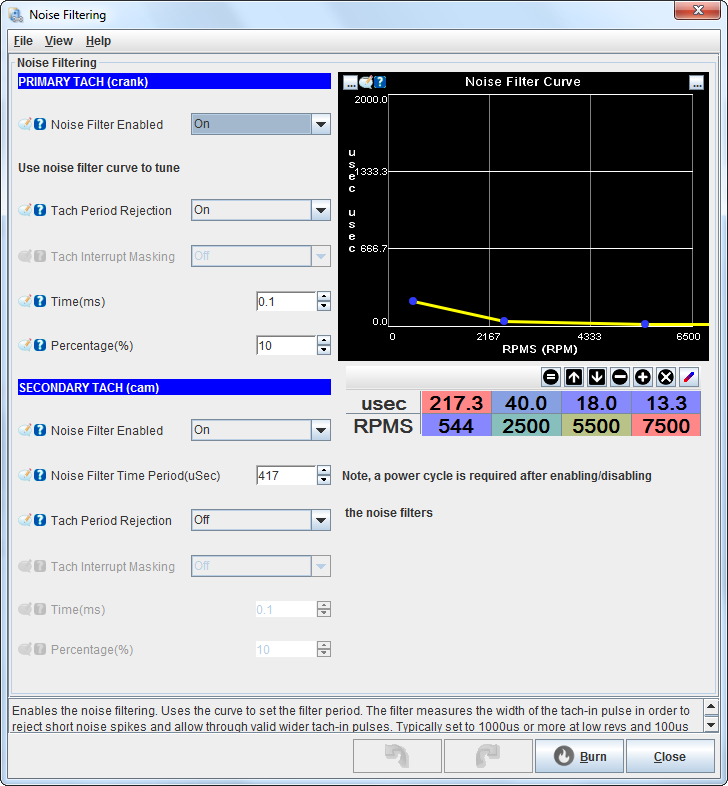Ich wundere mich jetzt ein wenig dass das Cam Signale im Composite Logger so aussieht wie auf dem Bild. Ich hätte erwartet, dass es invertiert ist sprich lange Low (da der Unterbrecher zu ist und auf Ground schaltet) und eine kurze Zeit High wenn der Unterbrecher beim Nocken offen ist und der PullUp das Signal hochzieht. Als Noise Filter habe ich den Cam Filter aktiviert da sonst nur kurze High Spikes im Logger zu sehen sind.