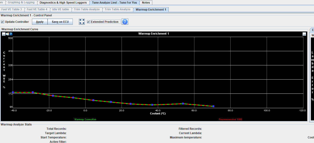 Es gibt da eine Funktion die Dir den Kaltstart oder besser Warmlauf ganz von selber einregelt. Ich lass die laufen bis der Motor warm ist und, das ist vielen nicht klar, SPEICHERE dann das was errechnet wurde. Nach 3 bis 4 Durchläufen ist dann für jede Motortemperatur ein sauberer Motorlauf gefunden. Der Witz dabei, er läuft danach eben auch OHNE Lambdasonde. Weil die ja kalt erst mal gar nicht funktioniert!