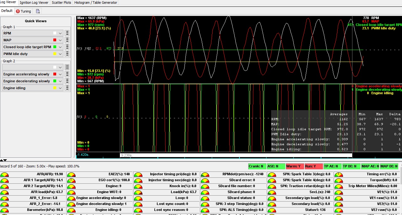 Dann wieder Testfahrt gemacht - mit Datalogging an, Autotune an, Lambdaregelung aus (Anzeige natürlich an). Jetzt läuft er warm ruhiger und er startet sogar warm ohne gasgeben - auch wenn er danach erstmal sägt, sich aber wieder beruhigt. Auch ein laufender Kühlerventilator der vorher für ein katastrophales Sägen im Leerlauf gesorgt hat, macht nun kaum einen Unterscheid mehr.