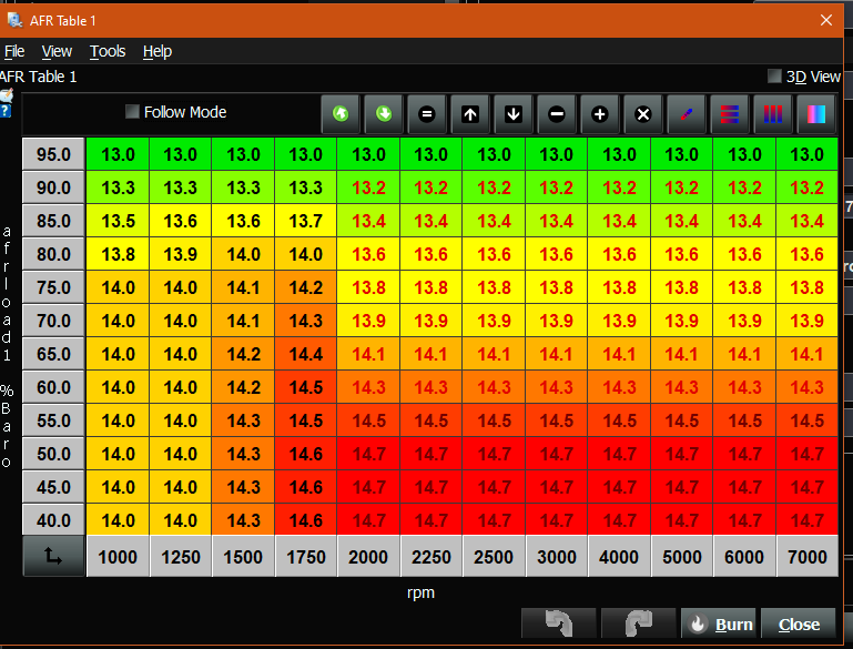was ich aber denke, was einen Einfluss hat: Deine Injection timing Tabelle hat eine ganz komische y-Achse. geht nur von 85 bis 90 und in dem Bereich ändert sich der Winkel teilweise krass. EInspritzzeitpunkt hat definitiv einen Einfluss auf ruckeln und Drehmoment. Wenn sich bei dir der Wert minimal ändert schwingt sich das gern auf. Da deckt man in der y-Achse normal den Bereich von Leerlauf bis Volllast ab...
