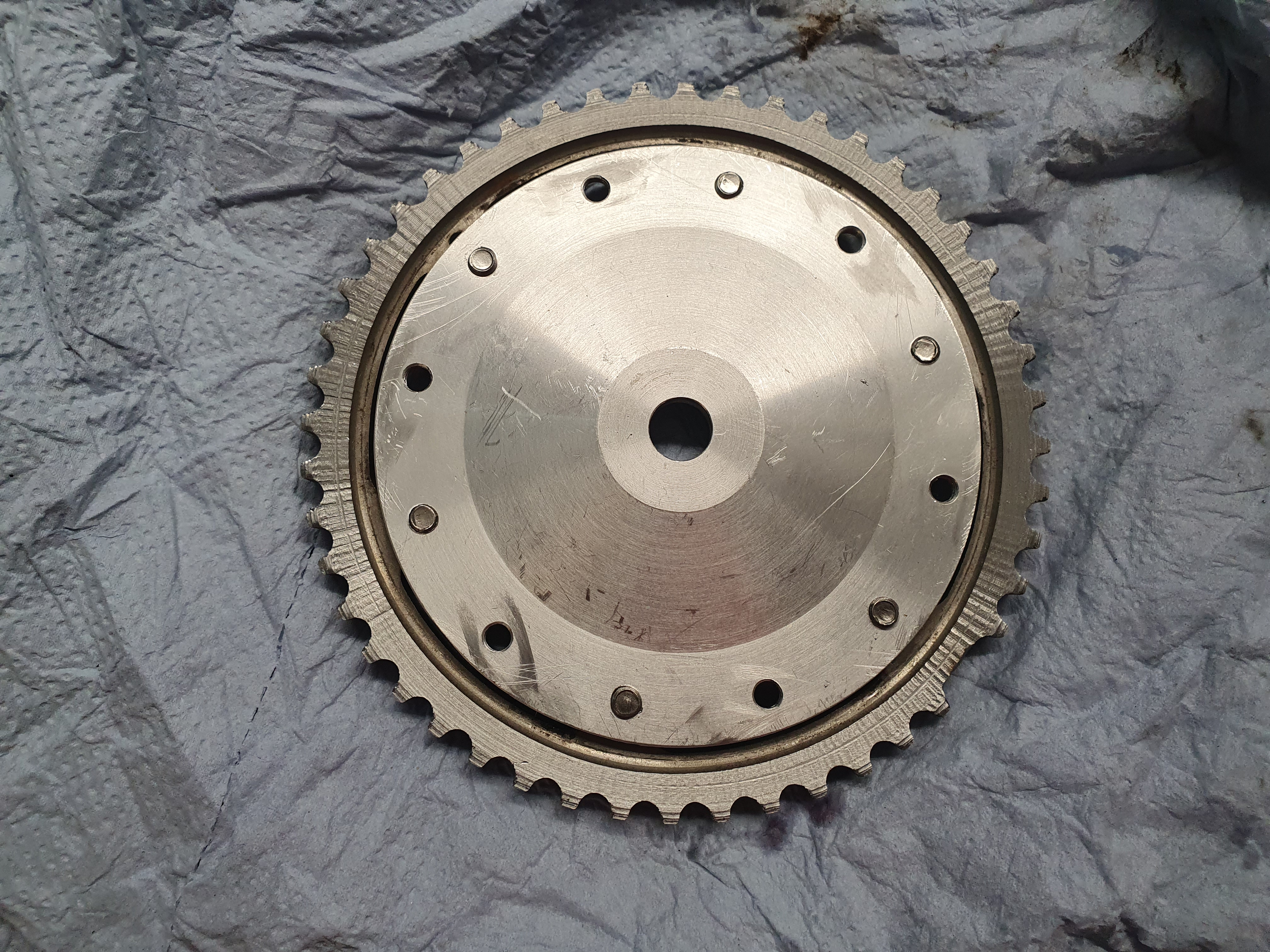 Auf der Rückseite wurde ein Anlasserzahnkranz aus nem Automatik-Modell angeschraubt (der passend abgedreht wurde). Lief auf er Straße alles super, bis zum ersten Trackday. Ein mal 6600 rpm gedreht und flunk...komisches Geräusch aus dem Maschinenraum.