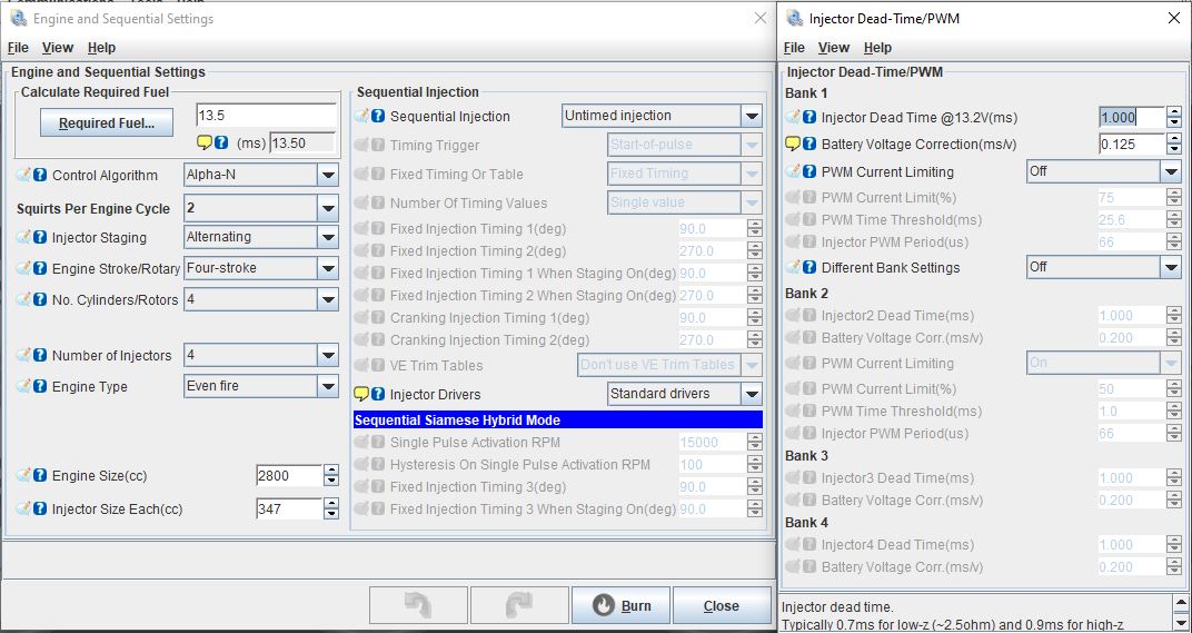 Ich habe es auf untimed injection und weiß nicht wie im Vergleich zu OT er einspritzt. Nennt man das dann batch? Würde auch auf Semi Sequentiell wechsel, aber dann muss ich auf 4 Squirts per Engine Cycle umstellen. Ich weiß nicht ob dazu meine Düsen nicht zu groß sind. (347ccm und im Leerlauf habe ich 3,7ms warm)