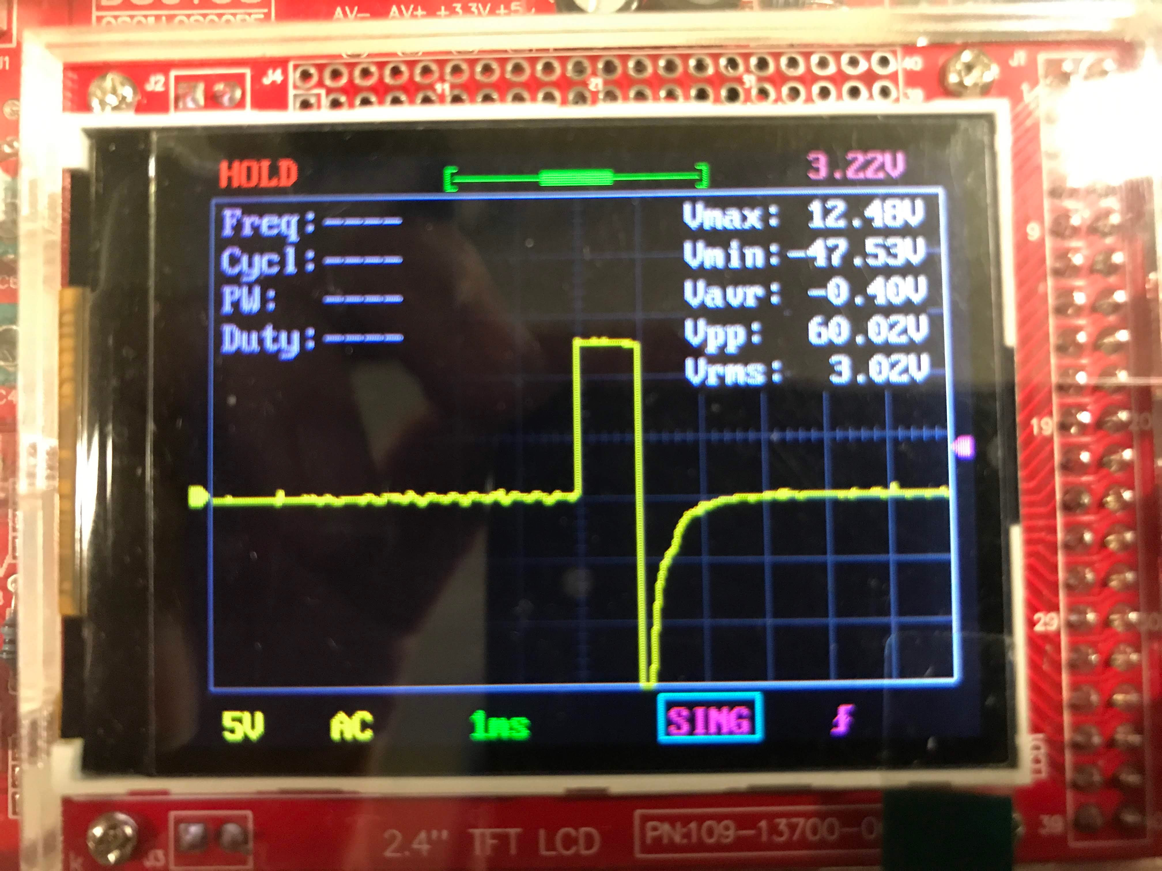 So soll es aussehen bei 1ms PW: So hat es ausgesehen wenn man nicht auf "Advanced Driver" umgestellt hat: Der Puls war etwas länger. Bei kleinen PW Werten hat das aber etwas ausgemacht im Vergleich zu den Ausgängen 1 und 2.
