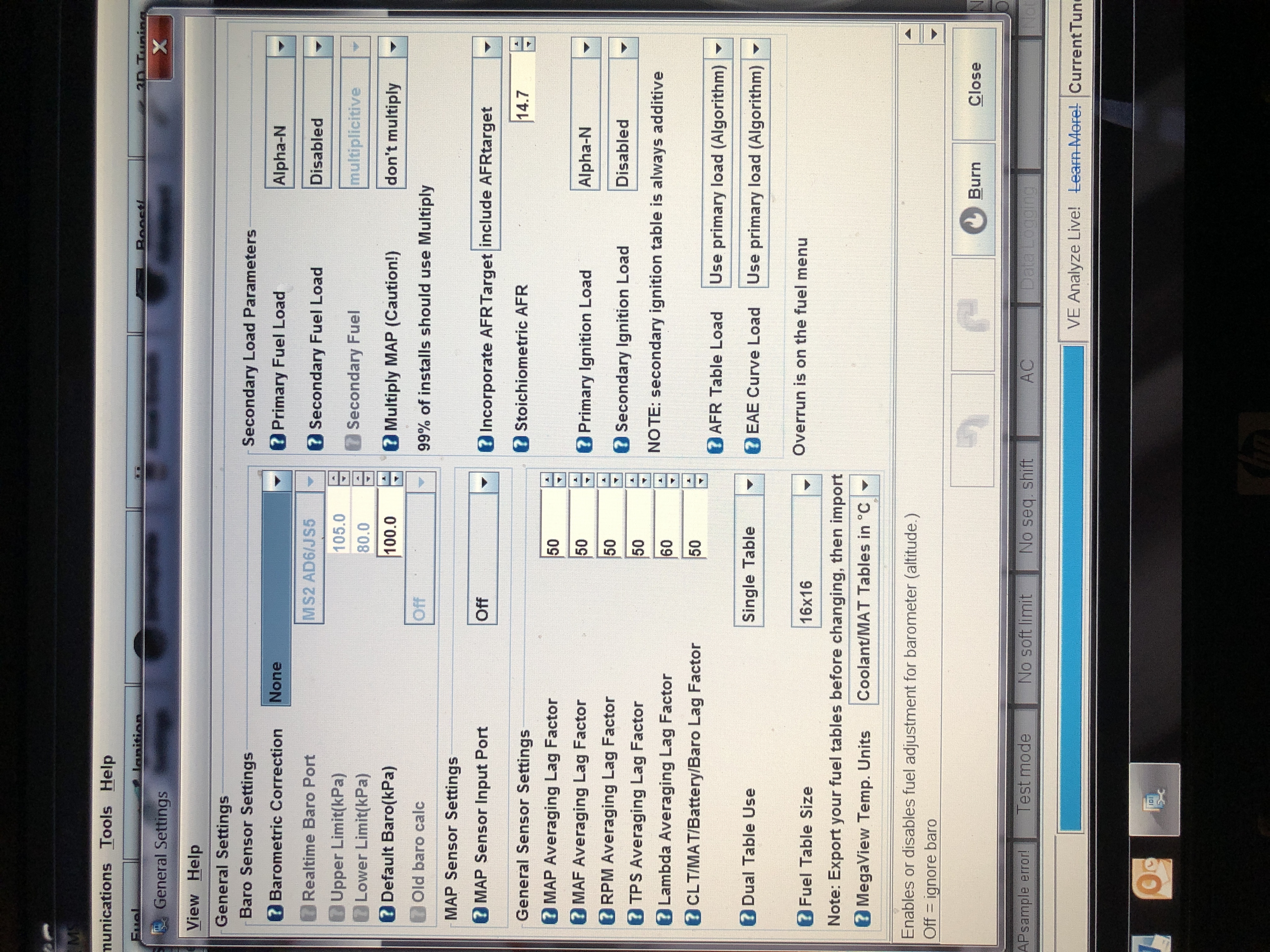 Steht vermutlich momentan auf Speed Density. Warum hast du keinen MAP Sensor? Du musst dann auf Alpha/N in den generellen Settings umstellen.Legend36 hat geschrieben:Wollte ihn eigentlich auch nur zum Laufen bekommen, Abstimmung wollte ich eigentlich machen lassen wenn ich dafür jemanden finde.