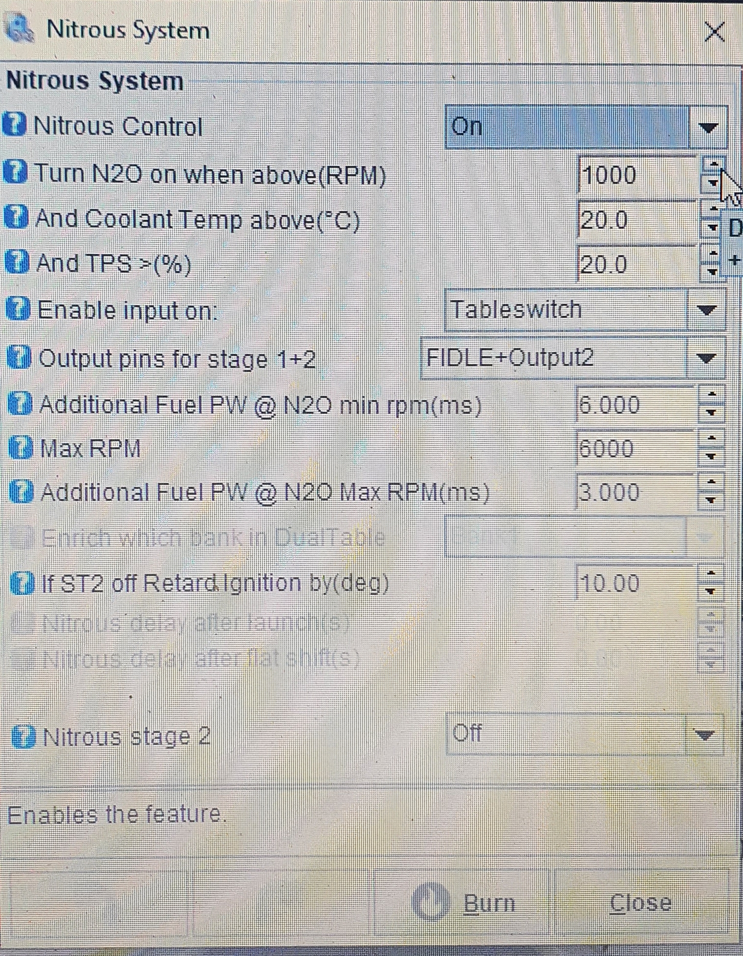 Ich fahre einen 1993 Ford Mustang mit einem 302 cui EFi Motor. Ich habe eine angeschlossene Lachgasanlage (Trocken) und möchte diese gerne, über mein Megasquirt gen 2 3.3.1 laufen lassen. Ich habe aber ein paar Probleme mit der Verkabelung und der Eistellung. Im SG habe ich eingestellt das der Nitrous Enable input on über den Tabelswitch läuft und Nitrous Output über FIDLE+Output2. Im Programmable On/Off Outputs habe ich Output2 aktiviert und nitrous_retard ausgewählt. Im Can Parameters ist Remote ports direction auf 1 Input, 2 Outputs und Use for remote on/off outputs Remote Port 2 ausgewählt. Ich bin überfragt wie ich es einstellen soll und ob ich noch was im SG umstecken muss. Ich möchte gerne das über einen 12V Schalter das System aktiviert wird und ich über den dafür freigegebenen Stecker ich es laufen lassen kann. Ich hoffe einer kann mir weiter helfen ich bedanke mich schon mal im voraus.
