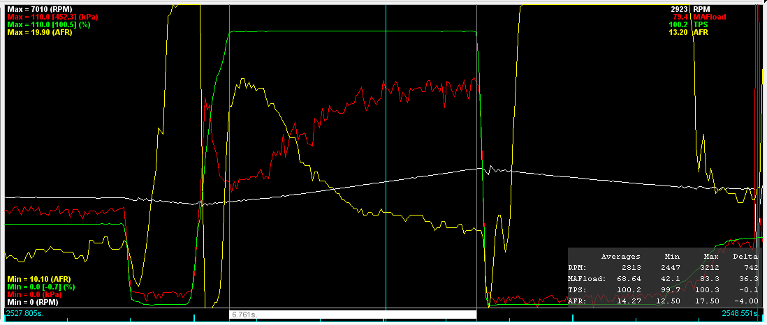 Angenommen, ich beschleunige von 2000/min Motordrehzahl an mit ca. 50-60% TPS, so liegt die MAFload bei etwa 80 - was ja völlig normal ist. Gebe ich dann jedoch 100% TPS, sinkt die MAFload auf 40-50, weshalb der Motor massiv abmagert (AFR ~17), da er Bereiche im Kennfeld anfährt, die eigentlich für viel niedrigere Lastzustände zuständig sind. Beim Drehzahldurchgang von etwa 3000/min steigt bei 100% TPS die MAFload schlagartig auf 80-90, was ja eigentlich WOT entspricht und damit passt.
