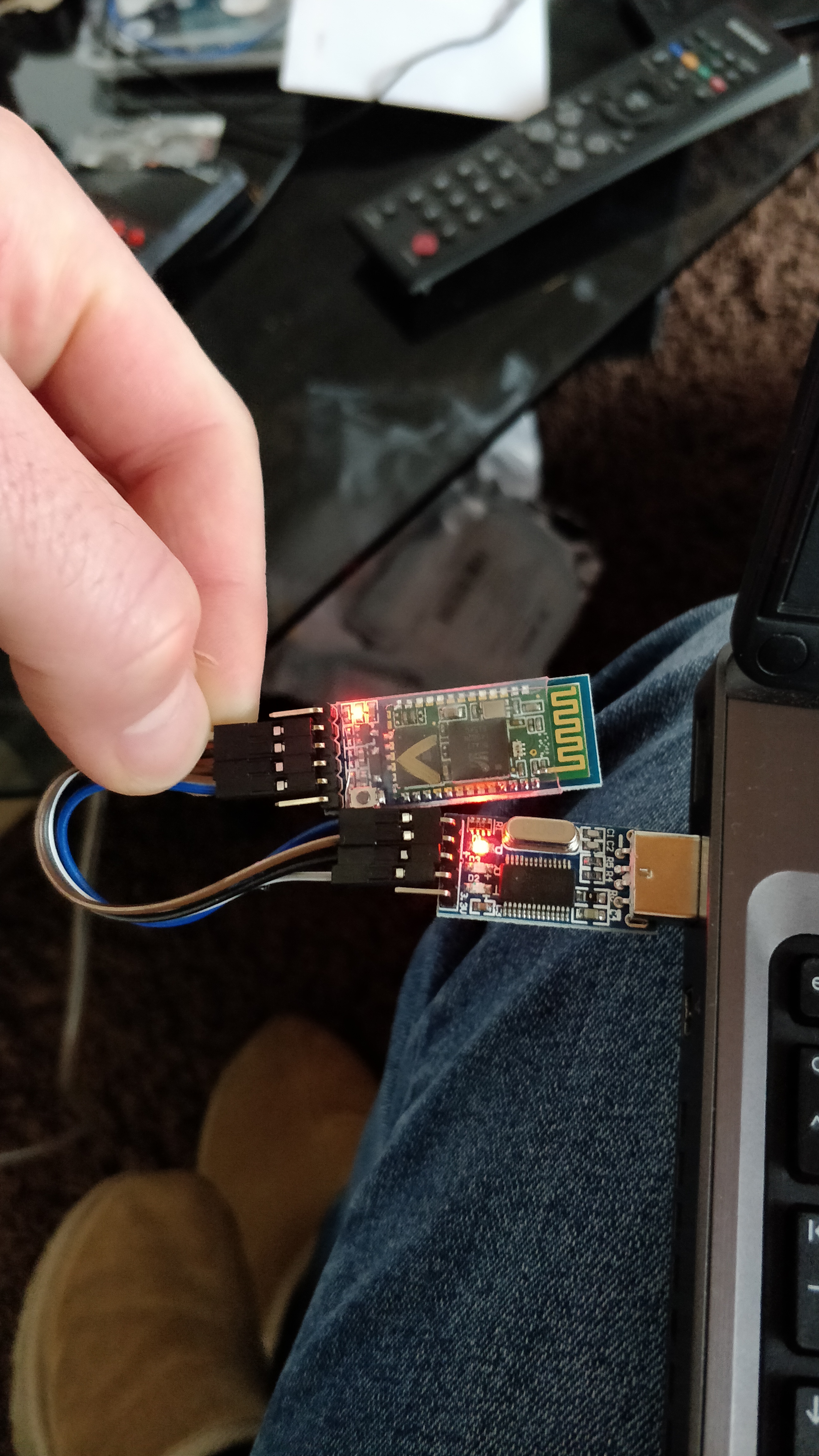 Also GND, RX, TX Verbinden und während ihr 5V Verbindet den Taster am HC_05 Drücken um ihn in der Programmiermodus zu bringen, wenn ihr das richtig gemacht hab blinkt er nun langsam.