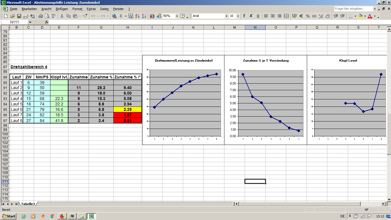 Ich hab mir mit Excel eine kleines Hilfswerkzeug für die Abstimmung am Prüfstand gebastelt, welches die Netto-Leistungszunahme, Leistungszunahme in Prozent und - wohl am wichtigsten - die prozentuale Leistungszunahme je +1°Vorzündung ausspuckt.