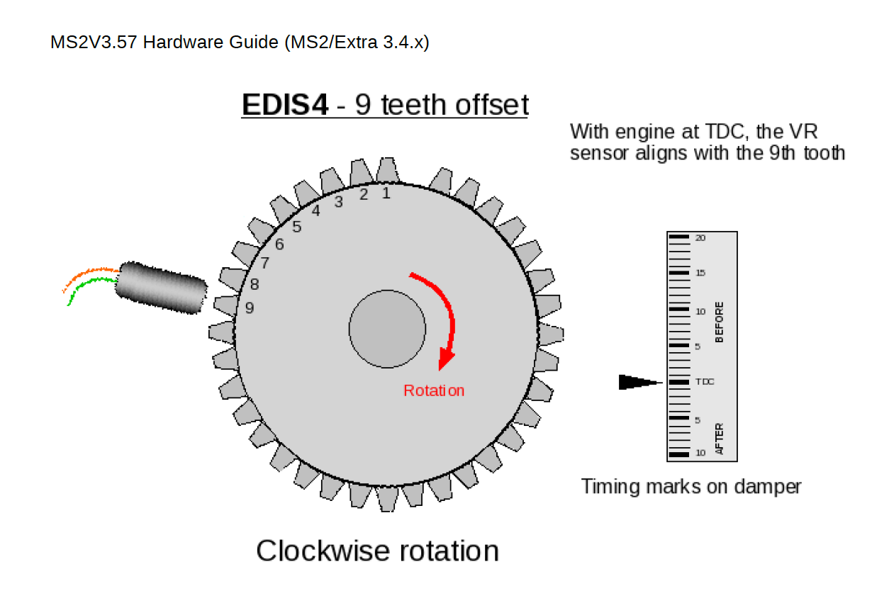Am leichtesten ist es den Zylinder 1 auf OT (TDC) zu bringen und da sollte der Hall- oder VR-Sensor auf den 8. bzw. 9. Zahn (Tooth) treffen und das entspricht dann auch der empfohlenen Lücke 90° vor OT beim 4-Zylinder
