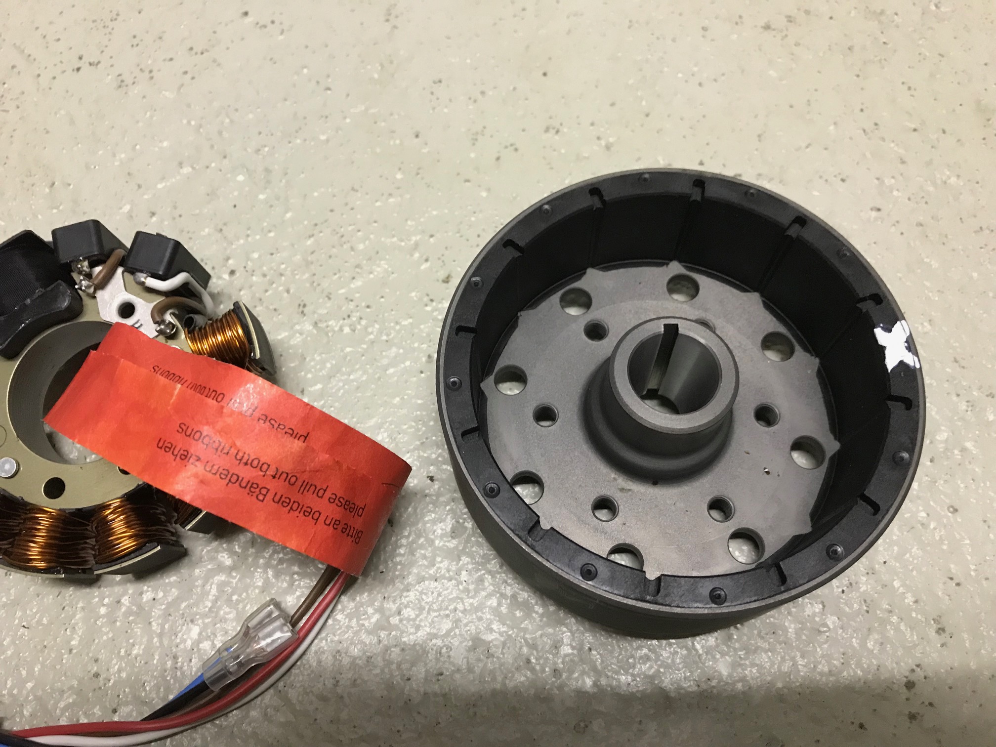 Das Bild zeigt den Stator der Zündung mit dem zweiteiligen Drehzahlsensor, der rechts der großen schwarzen Hochspannungsspule spule sitzt. Ich vermute es handelt sich um zwei kleine Spulen.