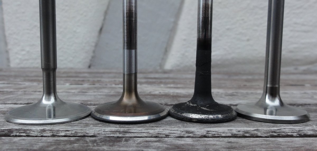 Meine erste Vermutung war, dass das Gemisch zu mager war: Ich fahre bei Teillast AFR 16, was der Motor klaglos ohne Ruckeln o.ä. mitmacht. Allerdings zeigen meine alten Fotos vom Aufbau 2015, dass die damaligen Serienventile ähnliche Spuren hatten (s.u.). Sah auch alles andere als toll aus. Und der Motor lief mit dem originalen Mapping der MBE sicher alles, bloß nicht zu mager