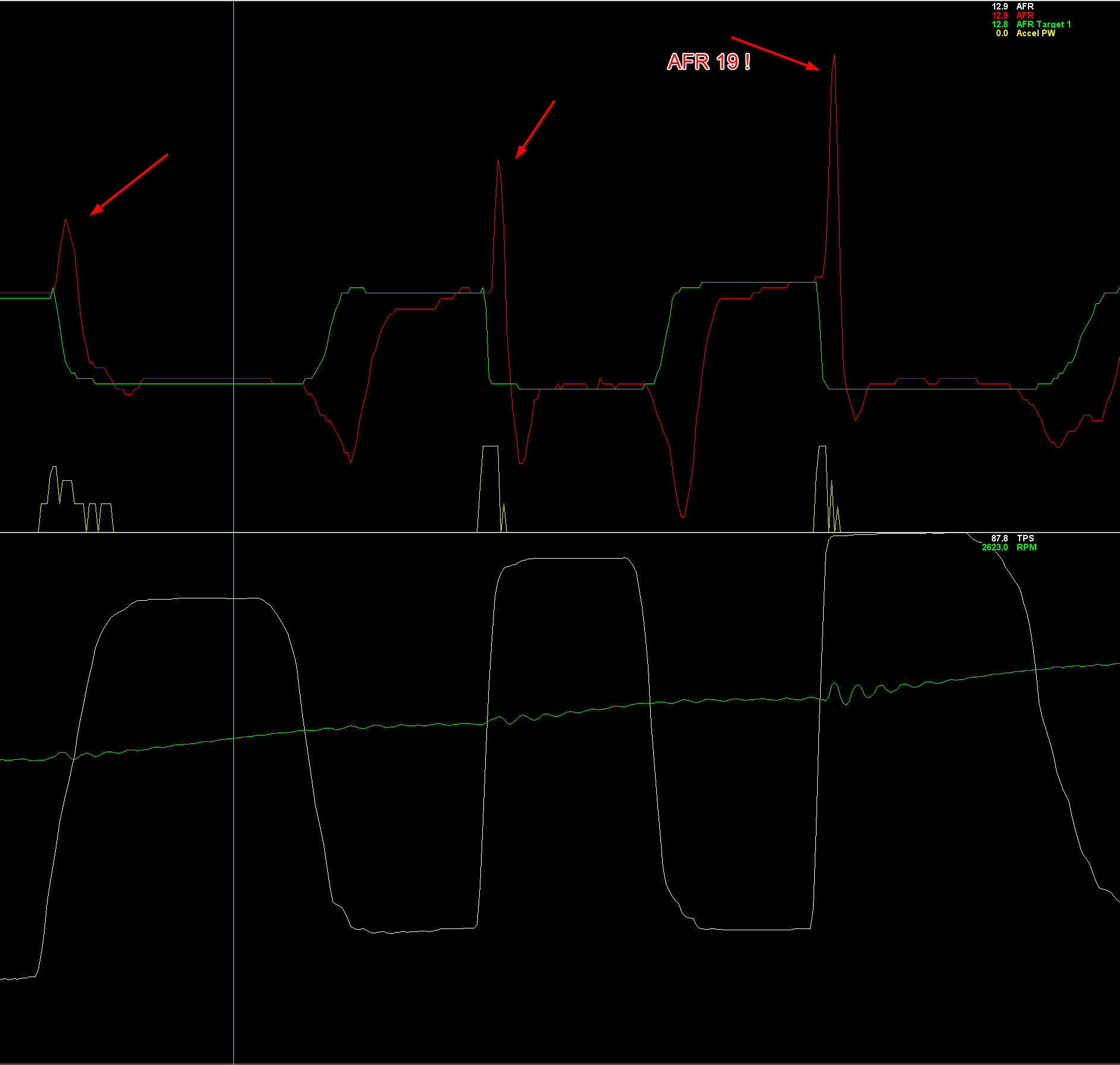 Beim harten beschleunigen bekomme ich fast immer einen AFR Magerpeak in meinen Log-Files. Es ist egal wie hoch ich den AddedFuel setze oder den Threshold verringere, der Peak kommt trotzdem. Es hat sich nichts an dem Peak verändert egal an welchen AccEnr. Parametern ich geschraubt habe