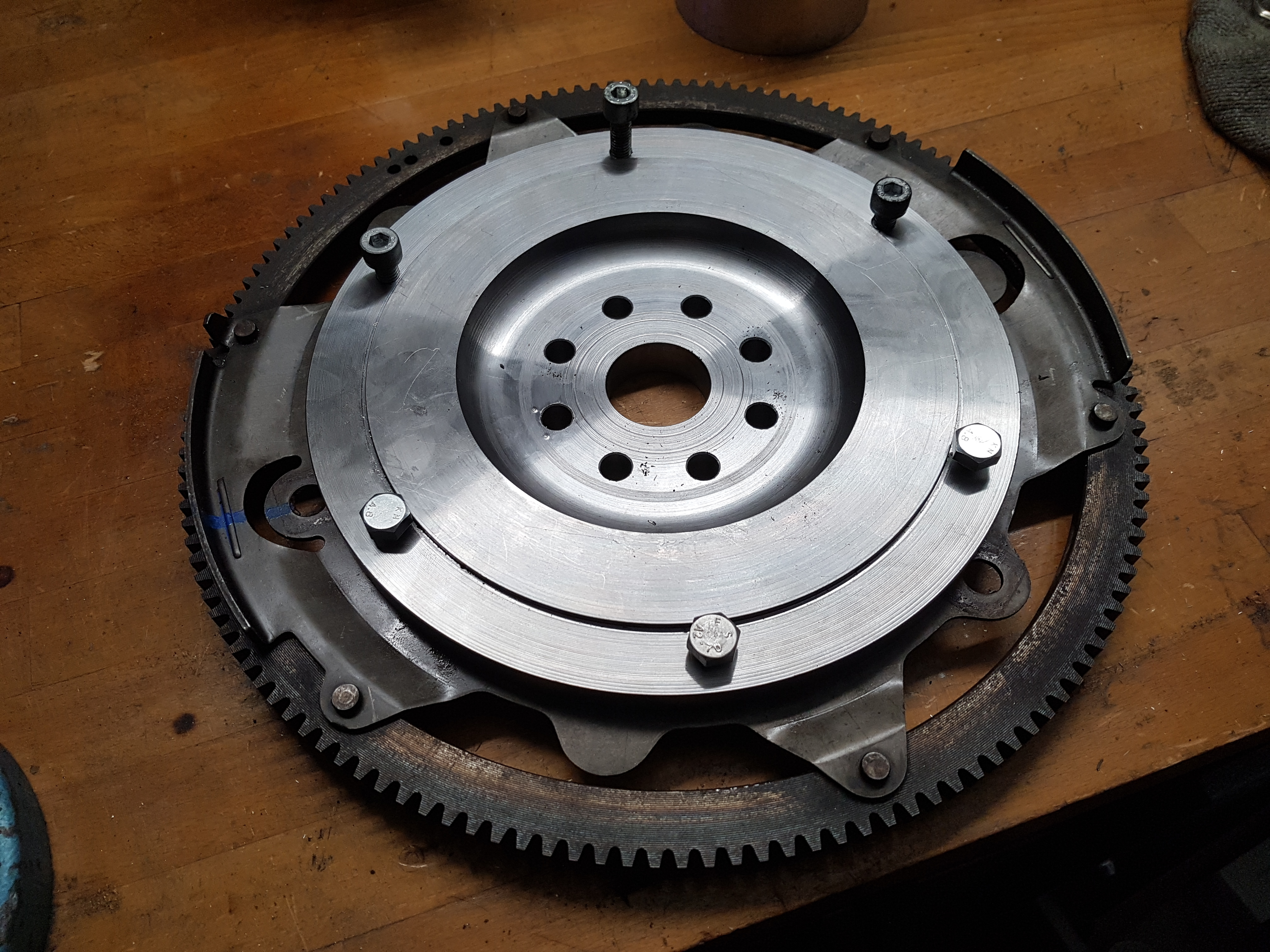 Auf der Rückseite wurde ein Anlasserzahnkranz aus nem Automatik-Modell angeschraubt (der passend abgedreht wurde). Lief auf er Straße alles super, bis zum ersten Trackday. Ein mal 6600 rpm gedreht und flunk...komisches Geräusch aus dem Maschinenraum.
