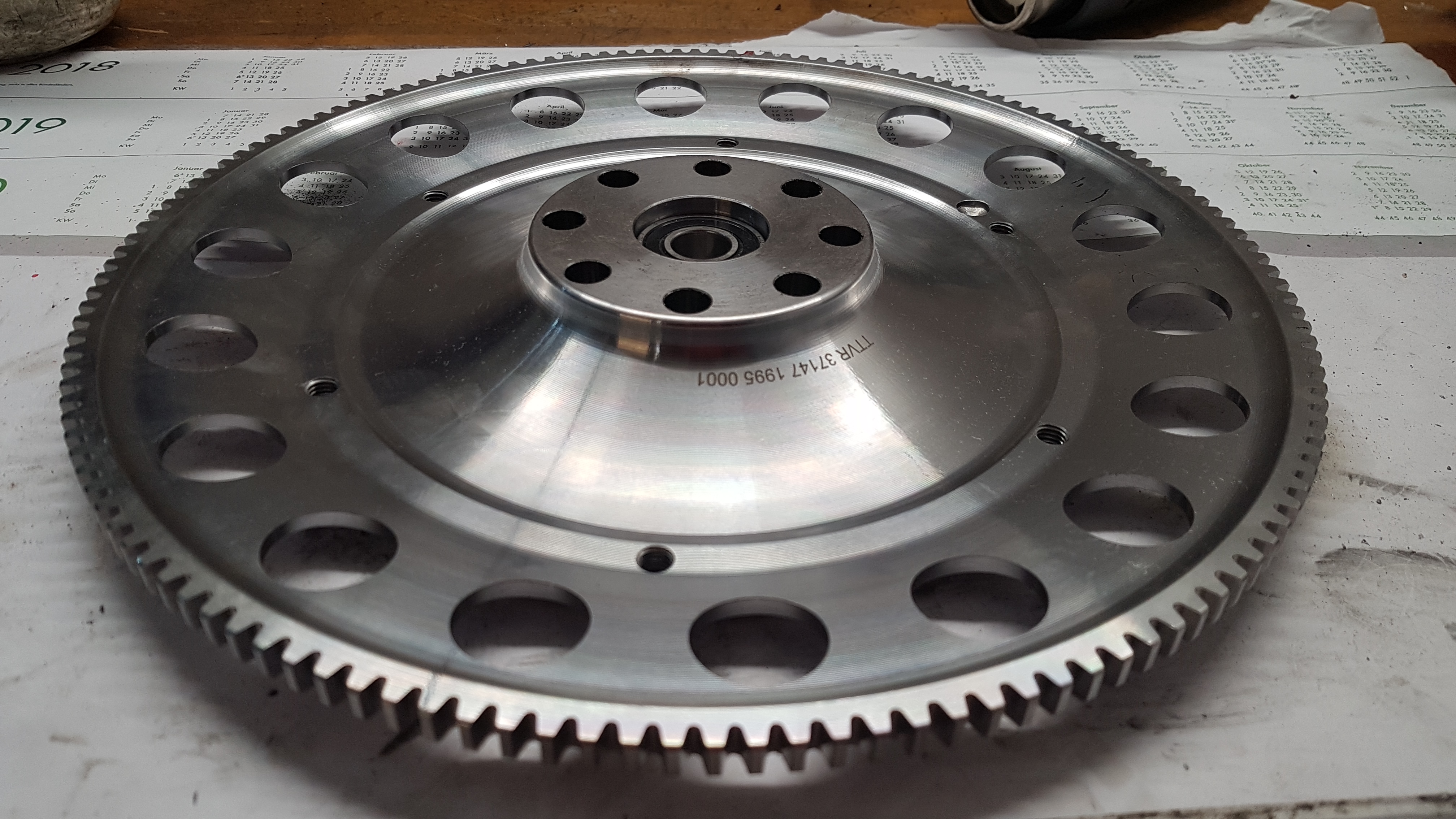 darüber hinaus hat eine neue Schwungscheibe Einzug gehalten. Ich bin ein absoluter Freund davon alles irgendwie selbst zu bauen und soweit es geht Großserienteile zu verwenden. Hier haben wir die Schwungscheibe ansich aus einem hochfesten Cromo Stahl gedreht. Das war echt ne halbe Katastrophe, weil das Zeug so zäh war.