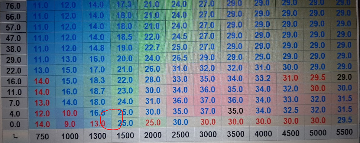 Besonders ist das aber bei recht niedrigen Drehzahlen. Zwischen 1500 und 2500 geht bei Volllast nicht viel. Er macht nur TPS abhängig verschieden modulierte Ansauggeräusche. Das liegt wahrscheinlich an der recht scharfen Nockenwelle. Aber was gibt man dem Motor in diesem Bereich (orange rechte Seite)? Fett und weniger Zündung? Was ist die Strategie bei einer scharfen Welle, wenn die Drehzahl noch zu untertourig ist? Und sagt jetzt nicht schalten