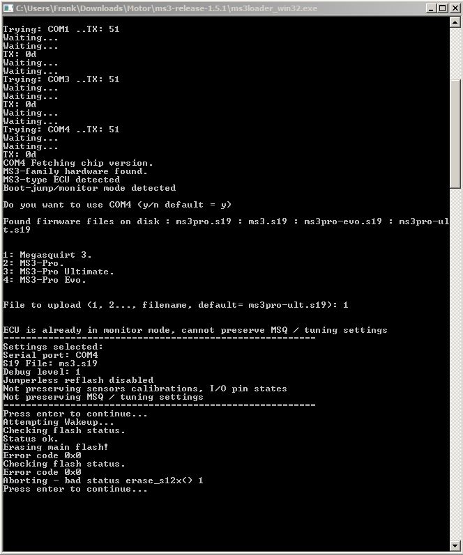 Also nochmal Firmware update in ts gestartet > plötzlich keine ms3 mehr gefunden. Also wieder zurück und Kommunikation prüfen > alles io ms3 bootload gefunden. Erneut FW update gestartet. FW v1.5.1 ausgewählt und weiter. jetzt kam der Fehler " löschen_s12x got an error code! reflashing fehlgeschlagen - bitte wiederholen.